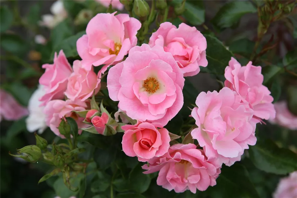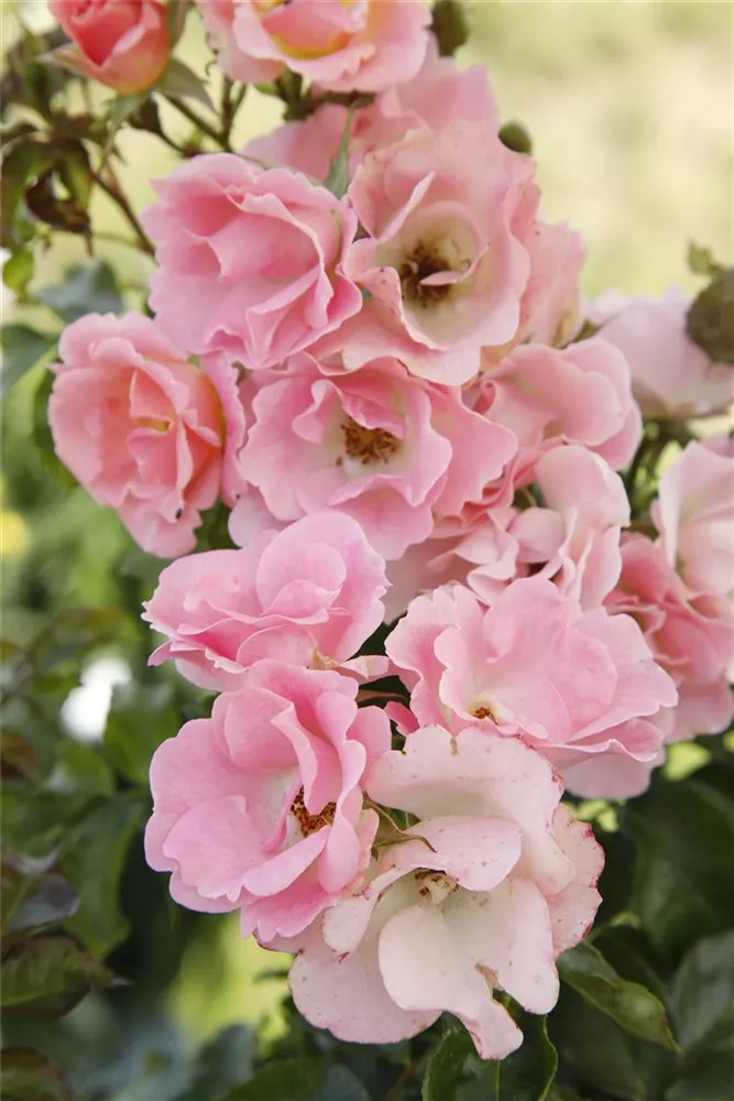 Die rosafarbenen, schalenförmigen Blüten der Beetrose 'Roselina'® erscheinen in Dolden von Juni bis September. Diese werden etwa 4 - 6 cm groß.
