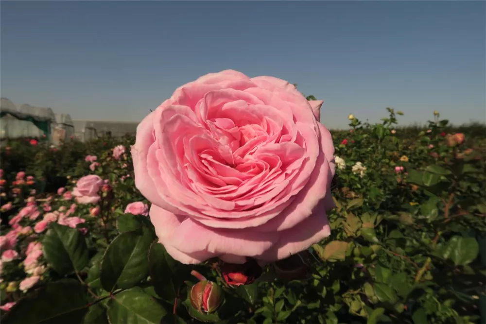 Die rosafarbenen, schalenförmigen Blüten sind starkgefüllt und erscheinen von Juni bis Oktober. Diese werden etwa 8 - 10 cm groß und sind stark duftend.