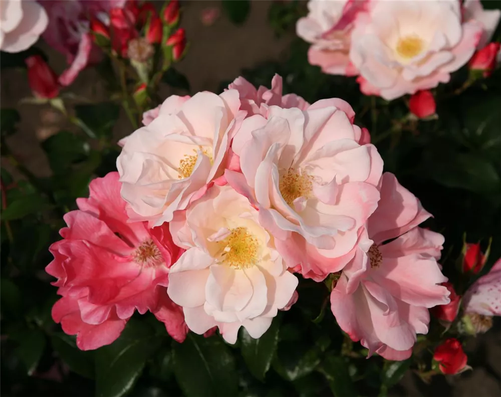 Die lachsrosafarbenen, halbgefüllten, schalenförmigen Blüten der Beetrose 'Roseromantic'® erscheinen in Dolden von Juni bis September. Diese werden etwa 7 - 8 cm groß.