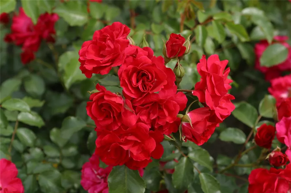 Die Beetrose 'Rotilia'® (Rosa) ist eine reichblühende Rose, die im Garten eine besondere Rolle spielt. Die zahlreichen halbgefüllten Blüten sind dunkelrot und erscheinen von Juni bis September. Ihr wunderbarer Duft entfaltet sich besonders an sonnigen, warmen Tagen. Mit den richtigen Begleitern an ihrer Seite, kommt die Königin der Blumen besonders gut zur Geltung. Niedrige Stauden, Lavendel und Salbei eignen sich ganz gut für diese Zwecke.
