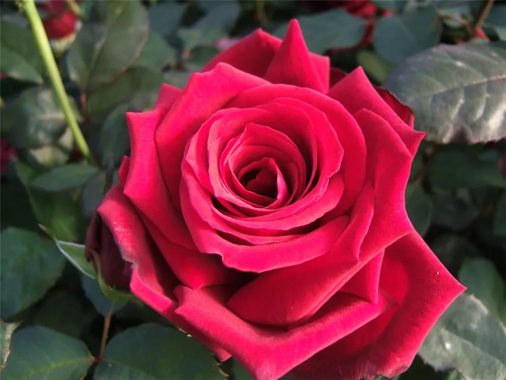 Die Edelrose 'Duftzauber 84'® (Rosa) ist eine reichblühende Rose, die im Garten eine besondere Rolle spielt. Die zahlreichen starkgefüllten Blüten sind dunkelrot und erscheinen von Juni bis Oktober. Ihr wunderbarer Duft entfaltet sich besonders an sonnigen, warmen Tagen. Mit den richtigen Begleitern an ihrer Seite, kommt die Königin der Blumen besonders gut zur Geltung. Niedrige Stauden, Lavendel und Salbei eignen sich ganz gut für diese Zwecke.