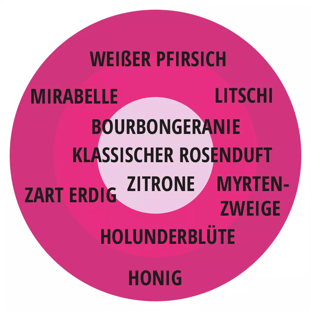 Die purpurroten, schalenförmigen Blüten sind starkgefüllt und erscheinen von Juni bis Oktober. Diese werden etwa 6 - 8 cm groß und sind stark duftend.