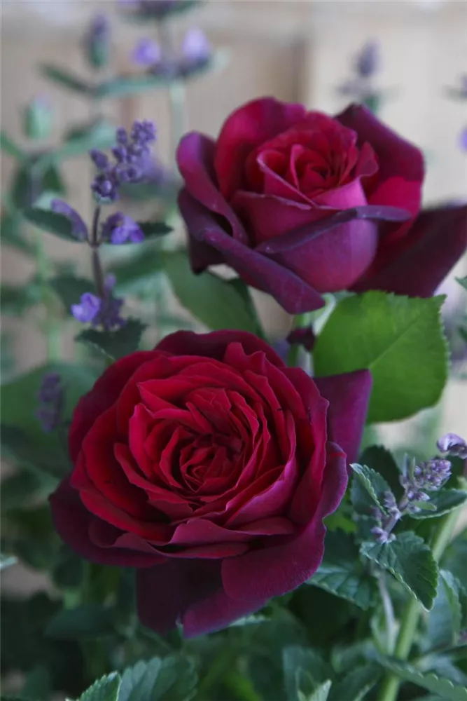 Die Edelrose 'Gräfin Diana'® (Rosa) ist eine reichblühende Rose, die im Garten eine besondere Rolle spielt. Die zahlreichen starkgefüllten Blüten sind purpurrot und erscheinen von Juni bis Oktober. Ihr wunderbarer Duft entfaltet sich besonders an sonnigen, warmen Tagen. Mit den richtigen Begleitern an ihrer Seite, kommt die Königin der Blumen besonders gut zur Geltung. Niedrige Stauden, Lavendel und Salbei eignen sich ganz gut für diese Zwecke.