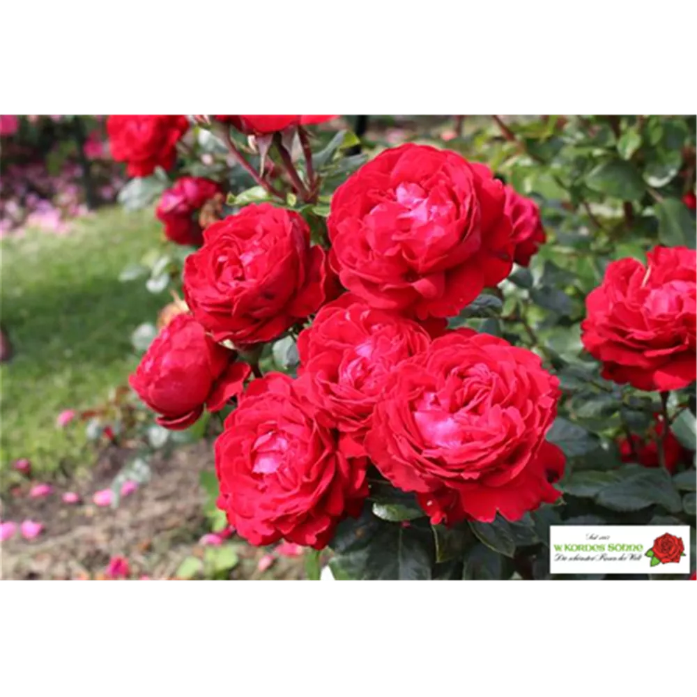Die roten, schalenförmigen Blüten sind starkgefüllt und erscheinen von Juni bis Oktober. Diese werden etwa 8 - 10 cm groß und sind leicht duftend.