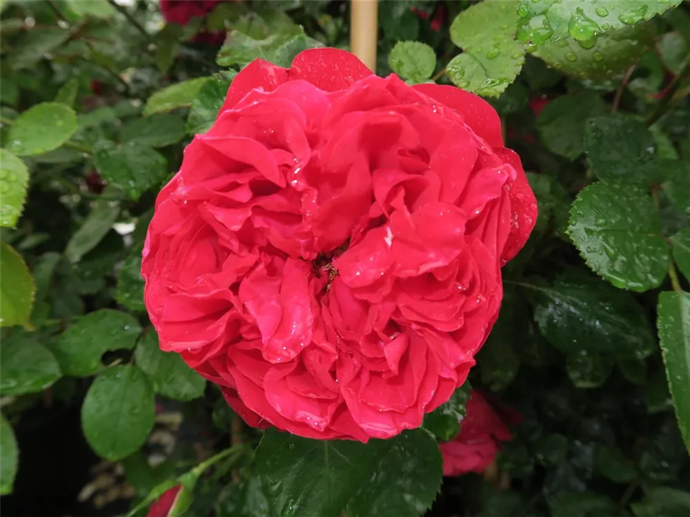 Die roten, schalenförmigen Blüten sind starkgefüllt und erscheinen von Juni bis Oktober. Diese werden etwa 8 - 10 cm groß und sind angenehm duftend.