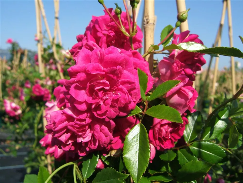 Die Kletterrose 'Super Excelsa'® (Rosa) ist eine reichblühende Rose, die im Garten eine besondere Rolle spielt. Die zahlreichen starkgefüllten Blüten sind rosa und erscheinen von Juni bis Oktober. Ihr wunderbarer Duft entfaltet sich besonders an sonnigen, warmen Tagen. Mit den richtigen Begleitern an ihrer Seite, kommt die Königin der Blumen besonders gut zur Geltung. Niedrige Stauden, Lavendel und Salbei eignen sich ganz gut für diese Zwecke.
