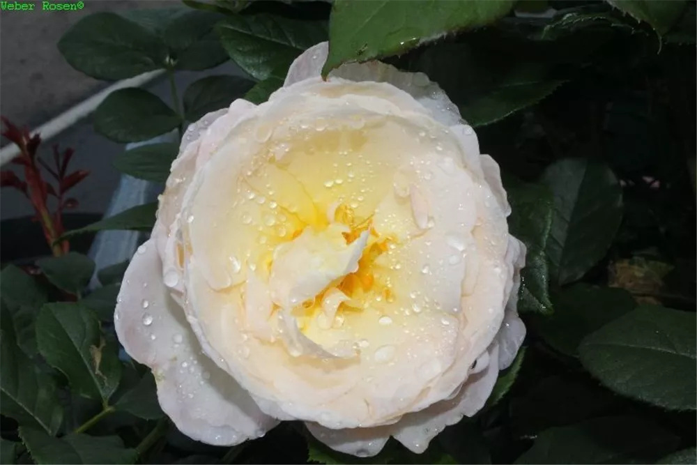 Die cremeweißen, schalenförmigen Blüten sind gefüllt und erscheinen von Juni bis Oktober. Diese werden etwa 8 - 10 cm groß und sind angenehm duftend.