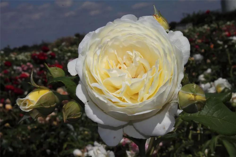 Die Strauchrose 'Claire Austin'® (Rosa) ist eine reichblühende Rose, die im Garten eine besondere Rolle spielt. Die zahlreichen gefüllten Blüten sind cremeweiß und erscheinen von Juni bis Oktober. Ihr wunderbarer Duft entfaltet sich besonders an sonnigen, warmen Tagen. Mit den richtigen Begleitern an ihrer Seite, kommt die Königin der Blumen besonders gut zur Geltung. Niedrige Stauden, Lavendel und Salbei eignen sich ganz gut für diese Zwecke.