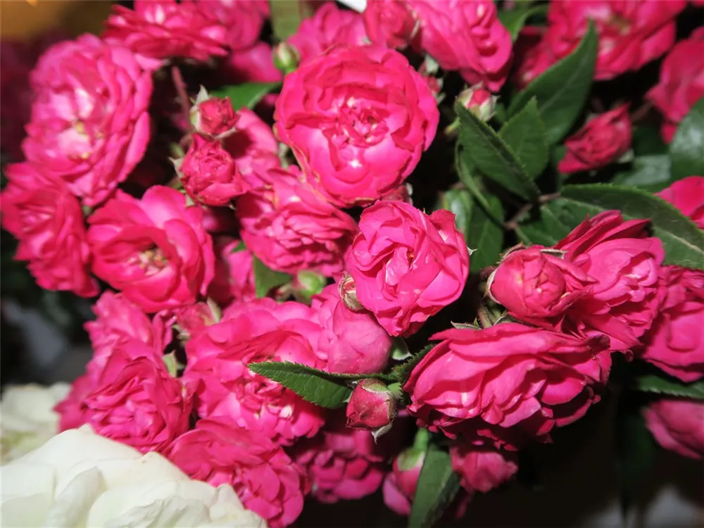 Die sommergrünen Blätter der Strauchrose 'Dinky'® sind dunkelgrün, gefiedert, wechselständig.