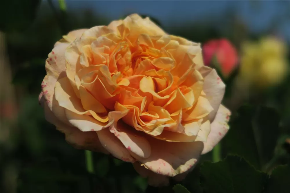 Rosa 'La Villa Cotta'® bringt von Juni bis Oktober weiße, rote, rosafarbene, gelb-orangene, starkgefüllte, schalenförmige Blüten hervor. Diese verströmen einen leichten Duft und werden etwa 8 - 10 cm groß.