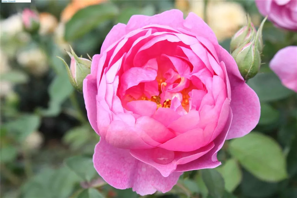 Die pinken, schalenförmigen Blüten sind starkgefüllt und erscheinen von Juni bis Oktober. Diese werden etwa 8 - 10 cm groß und sind angenehm duftend.