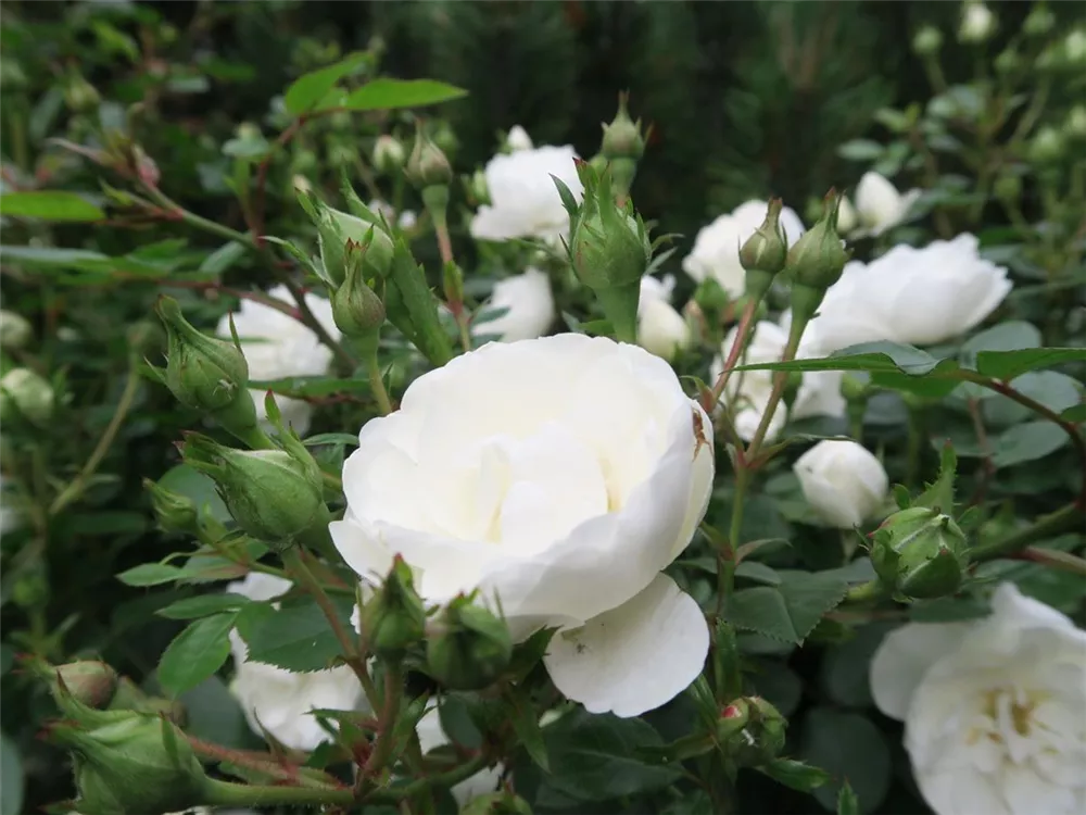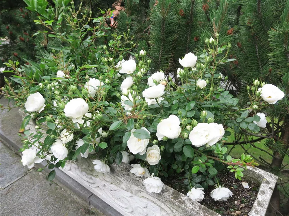 Die Zwergrose 'White Babyflor' (Rosa) ist eine reichblühende Rose, die im Garten eine besondere Rolle spielt. Die Blüten sind weiß und erscheinen zahlreich von Juni bis Oktober. Mit den richtigen Begleitern an ihrer Seite, kommt die Königin der Blumen besonders gut zur Geltung. Niedrige Stauden, Lavendel und Salbei eignen sich ganz gut für diese Zwecke.