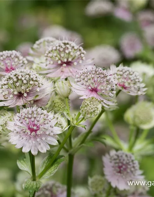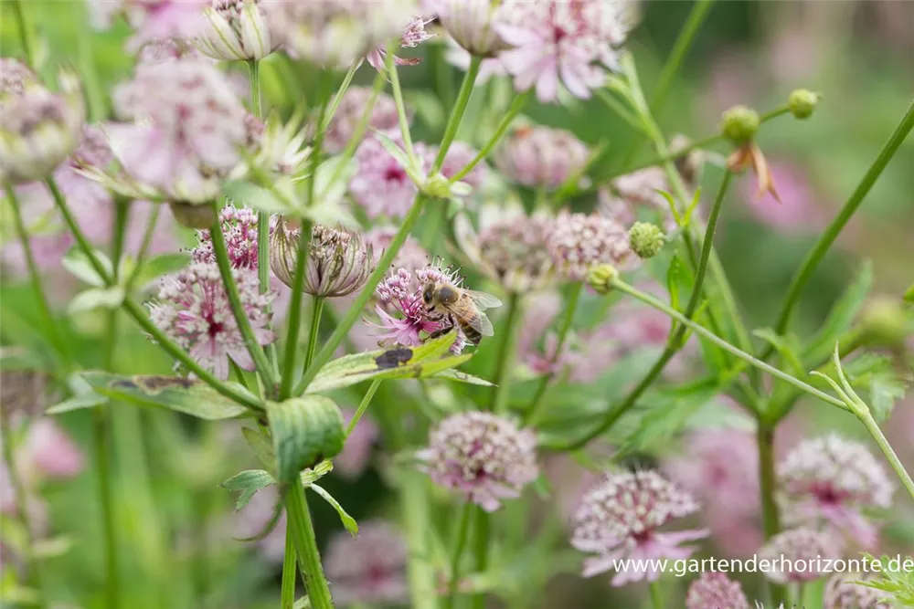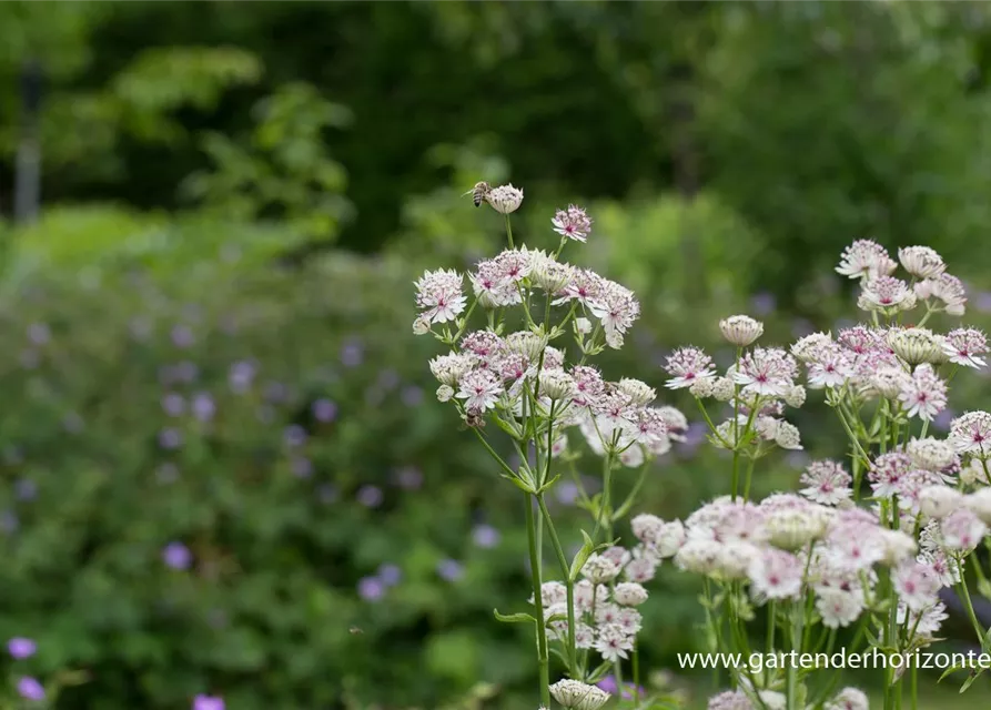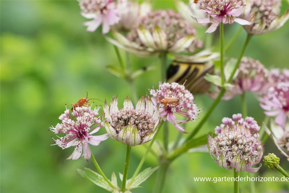 Astrantia major bildet sternförmige, in Dolden angeordnete, rosa-weiße Blüten ab Juni.