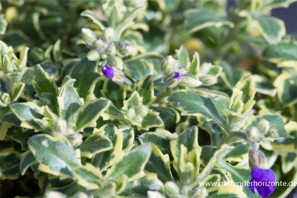 Hoher Blattschmuckwert. Die immergrünen Blätter des Garten-Blaukissens 'Silberrand' sind grün, eiförmig und weisen einen silberweißen Rand auf.