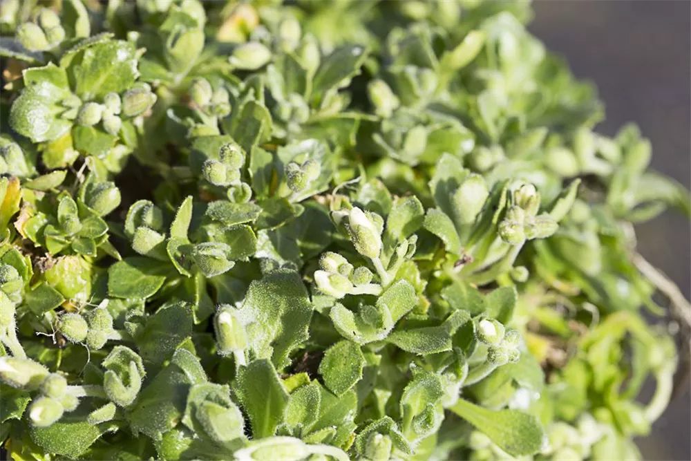 Aubrieta x cultorum 'Winterberg' bildet gefüllte, radförmige, weiße Blüten ab April.