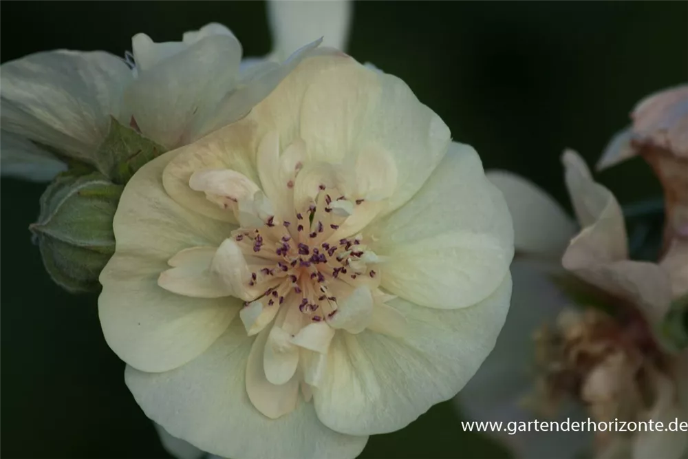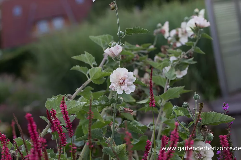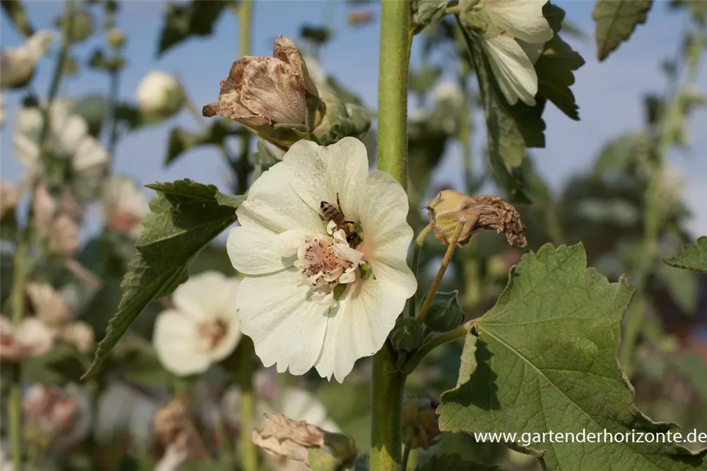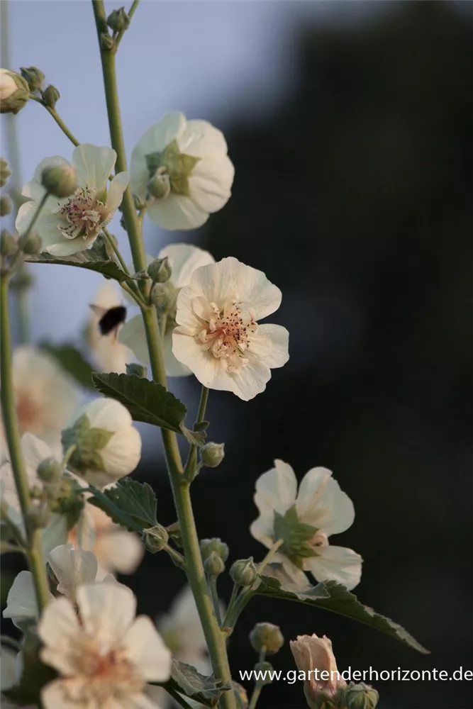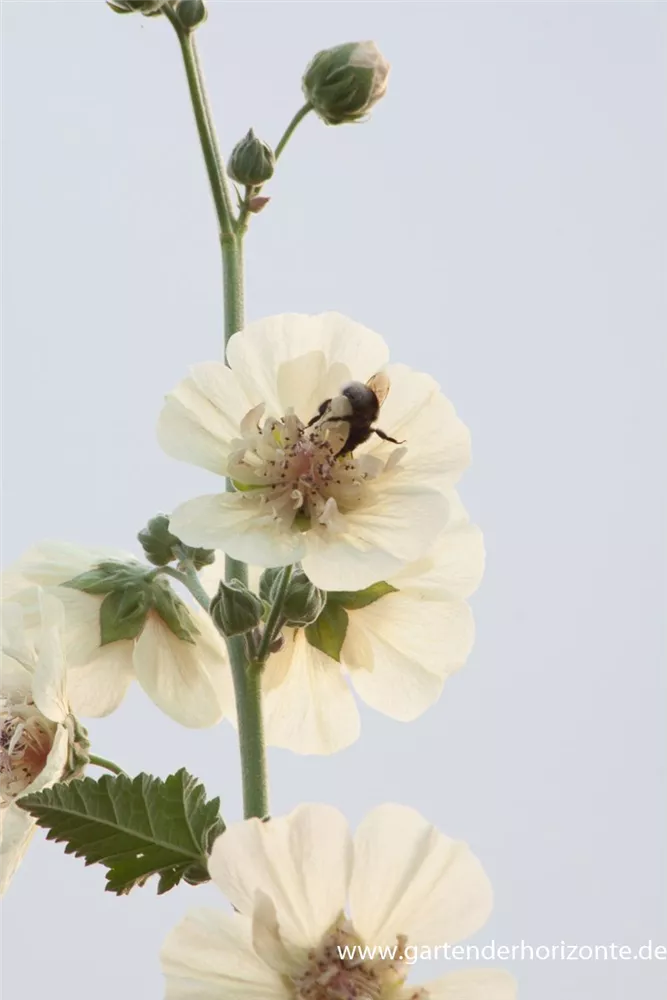 Alcea suffrutescens 'Parkallee' bildet halbgefüllte, schalenförmige, cremeweiße Blüten ab Juli. Diese verströmen einen angenehmen Duft.