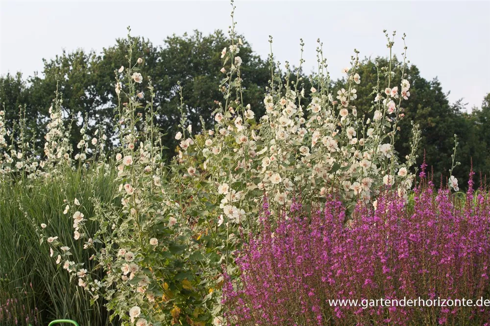Die Bastardmalve 'Parkallee' (Alcea suffrutescens) ist eine aufrechte, schlanke Staude, die von Juli bis Oktober cremeweiße, schalenförmige Blüten mit einem angenehmen Duft bildet. An einem sonnigen Standort mit kalkfreiem Boden erreicht sie gewöhnlich eine Höhe von ca. 2 m und wird ca. 1,5 m breit. Die Bastardmalve 'Parkallee' ist an geschützten Standorten gut frostverträglich.