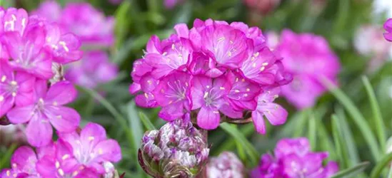 Armeria pseudarmeria 'Ballerina Lilac' bildet ballförmige, lilafarbene Blüten ab Juni.
