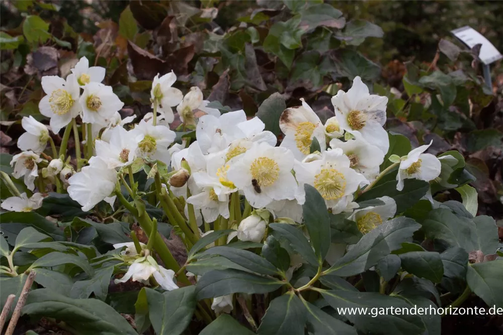 Helleborus niger bildet schalenförmige, weiße Blüten ab Dezember.