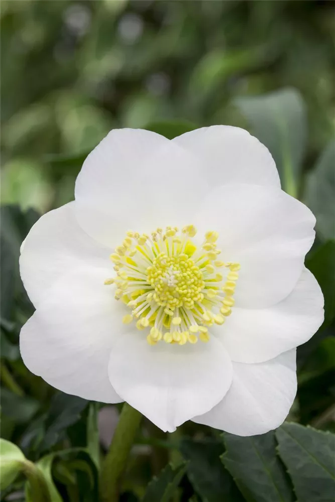Helleborus niger 'Wintersun'® bildet schalenförmige, weiße Blüten ab November.