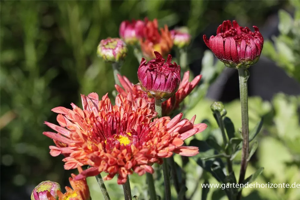 Die Winteraster (Chrysanthemum x grandiflorum) ist eine buschige wintergrüne Staude, die von September bis Oktober dunkelrote, körbchenartige Blüten bildet. An einem sonnigen bis halbschattigen, windgeschützten Standort mit durchlässigem, humosem, sandigem Boden erreicht sie gewöhnlich eine Höhe von ca. 1 m und wird ca. 80 cm breit. Die Winteraster ist gut frostverträglich.
