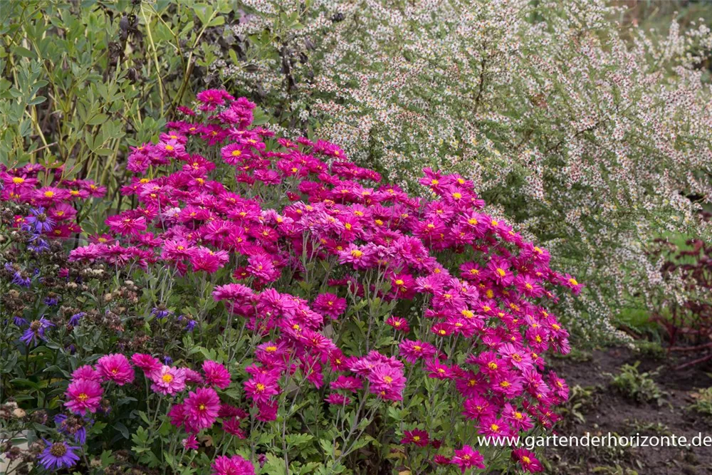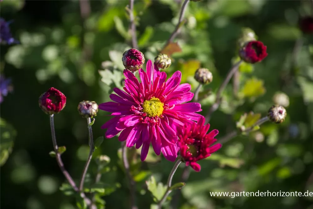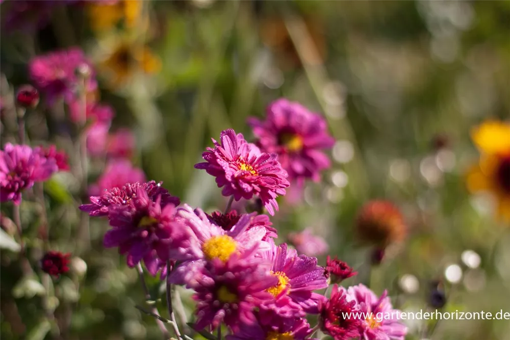 Die Winteraster (Chrysanthemum x grandiflorum) ist eine buschige wintergrüne Staude, die von September bis Oktober dunkelrote, körbchenartige Blüten bildet. An einem sonnigen bis halbschattigen, windgeschützten Standort mit durchlässigem, humosem, sandigem Boden erreicht sie gewöhnlich eine Höhe von ca. 1 m und wird ca. 80 cm breit. Die Winteraster ist gut frostverträglich.