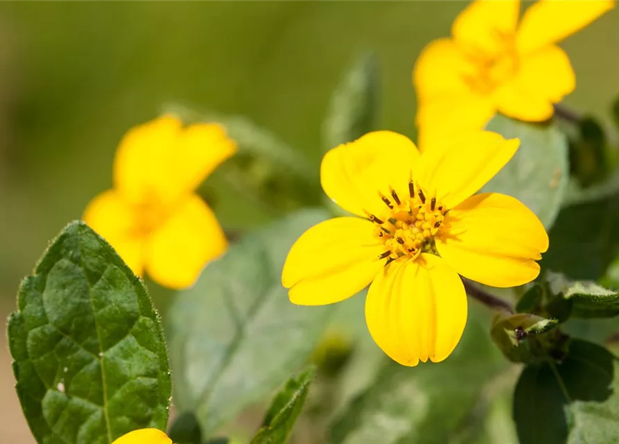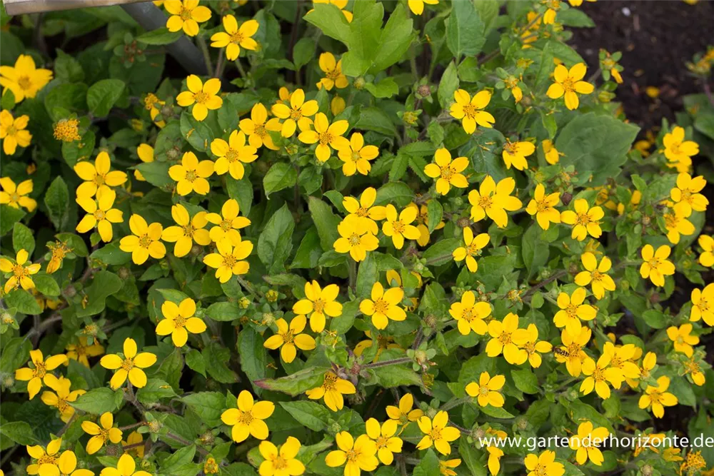 Chrysogonum virginianum bildet körbchenartige, gelbe Blüten ab Mai.