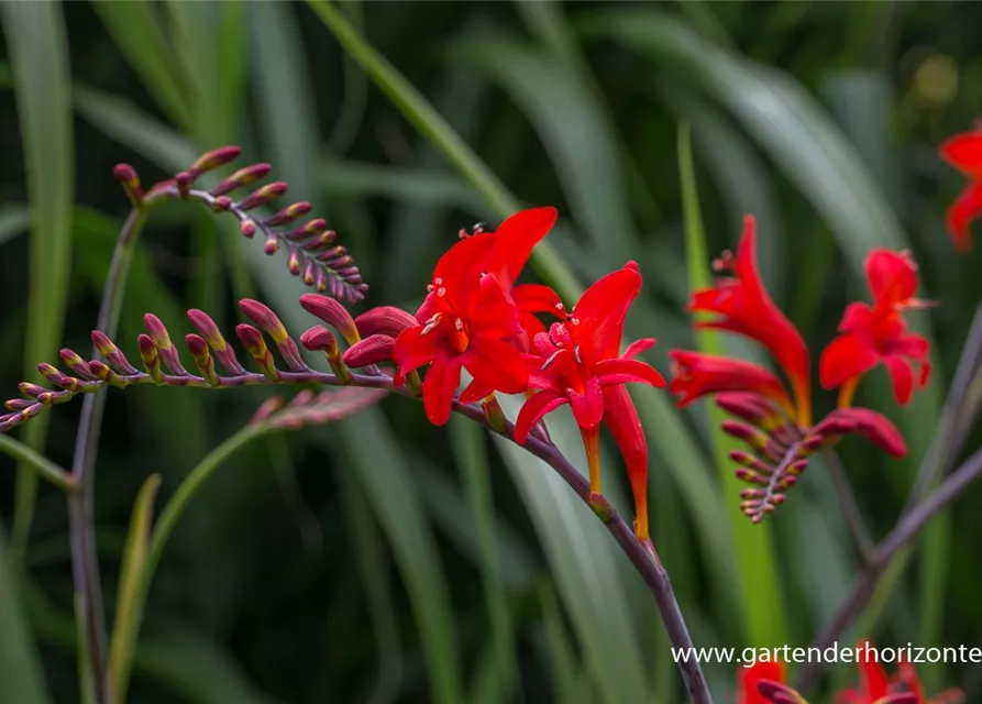 Die Garten-Montbretie 'Lucifer' (Crocosmia x crocosmiiflora) bringt ansehnliche, rote Blüten von Juli bis August hervor. Bevorzugt wird ein durchlässiger, locker wachsender, nährstoffreicher Boden in sonniger Lage. Die aufrechte Staude erreicht gewöhnlich eine Höhe von 1 - 1,2 m und wird bis zu 40 cm breit.