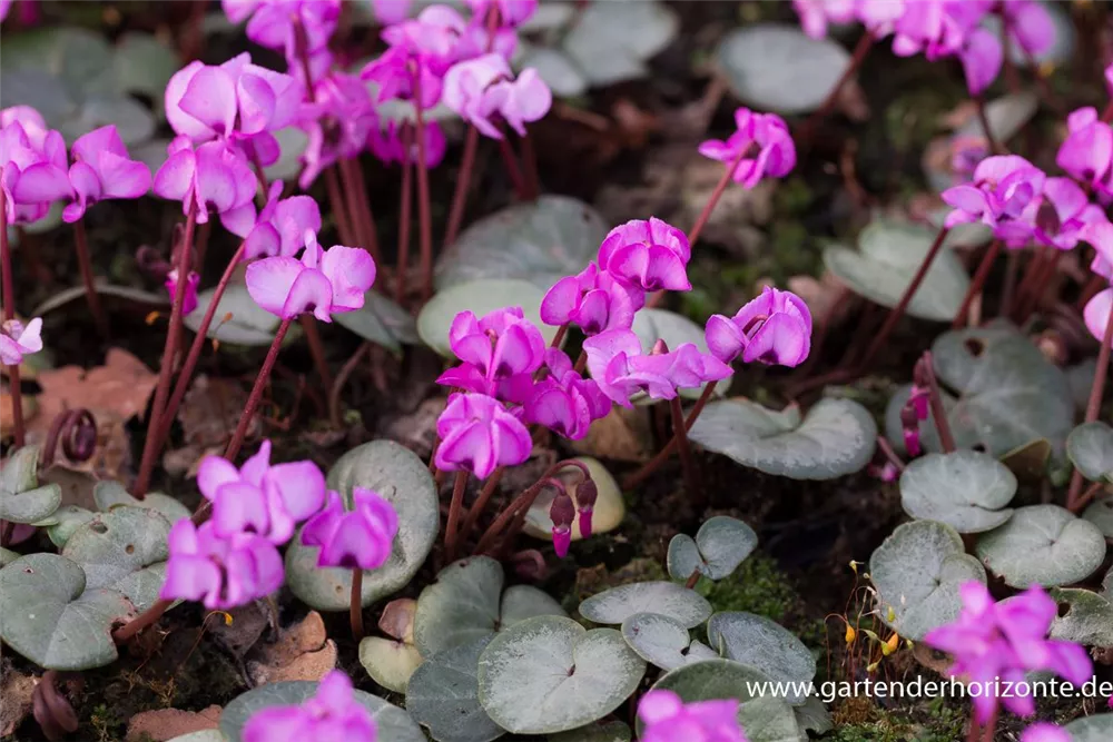 Das Frühlings-Alpenveilchen (Cyclamen coum) ist eine aufrechte wintergrüne Staude, die von Februar bis März karminrote Blüten mit einem angenehmen Duft bildet. An einem halbschattigen Standort mit durchlässigem, humosem, nährstoffreichem Boden erreicht es gewöhnlich eine Höhe von ca. 15 cm und wird ca. 15 cm breit. Das Frühlings-Alpenveilchen ist gut frostverträglich.