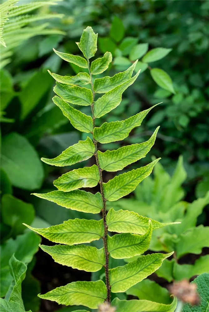 Der Bogen-Sichelfarn (Cyrtomium falcatum) ist mit seiner hellgrünen Blattfärbung ein dekoratives Gestaltungselement im Garten, welches sich an einem halbschattigen bis schattigen Standort mit einem möglichst durchlässigen, nährstoffreichen Boden am wohlsten fühlt. Bei günstigen Bedingungen erreicht dieser Farn eine Höhe von ca. 60 cm und wird bis zu 40 cm breit.
