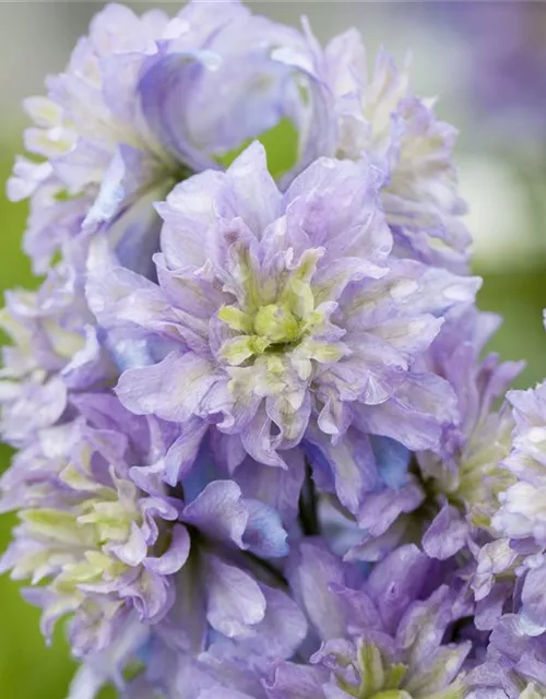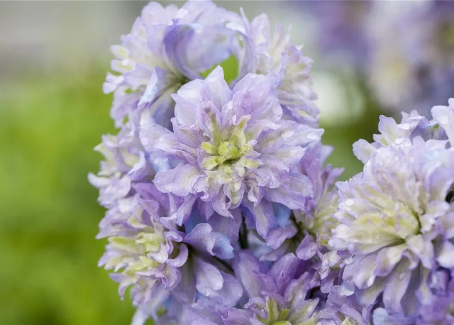 Delphinium x elatum 'Blueberry Pie'® bildet gefüllte, schalenförmige, in Rispen angeordnete, lilafarbene Blüten ab Mai.