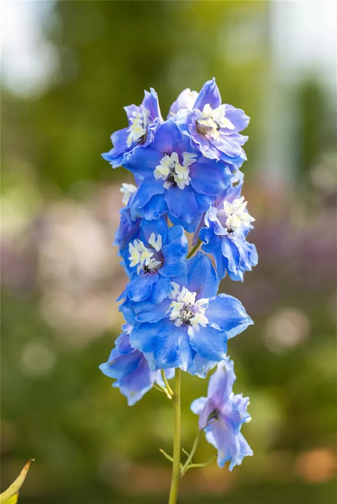 Delphinium 'Magic Fountains Sky Blue White Bee' wächst kompakt und erreicht gewöhnlich eine Höhe von 70 - 90 cm und wird bis zu 20 - 40 cm breit.