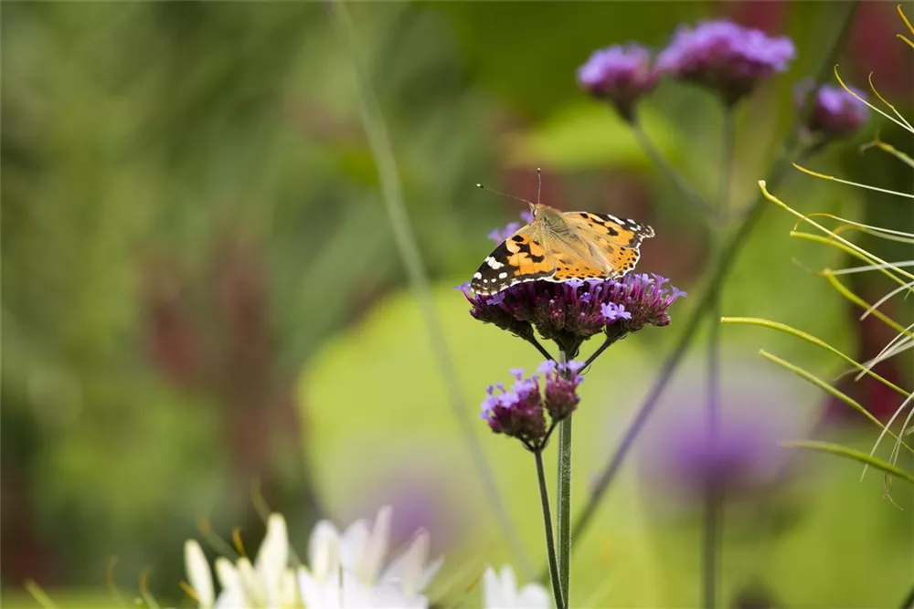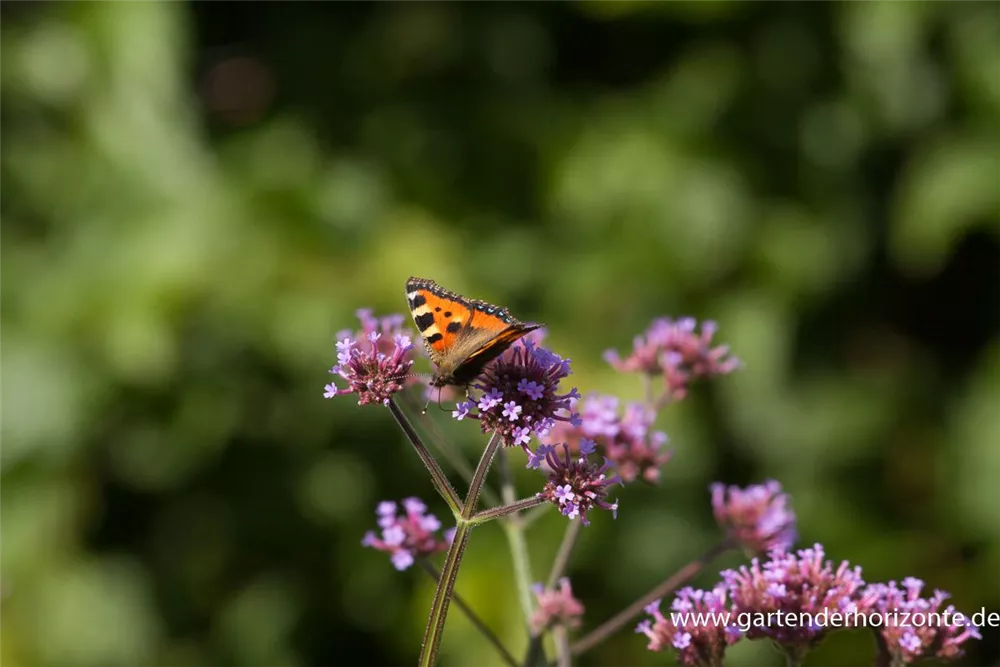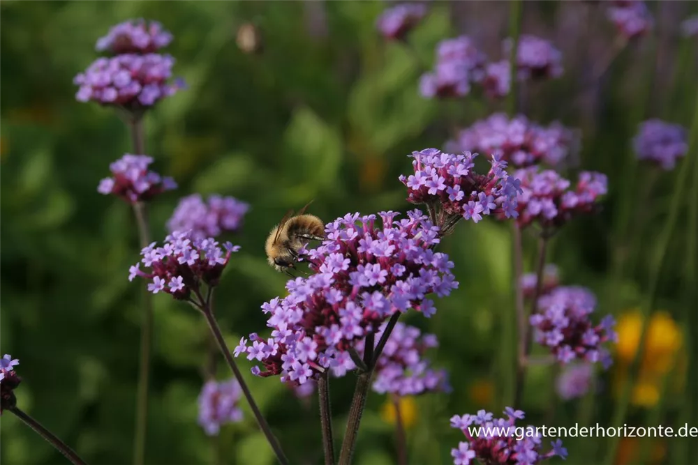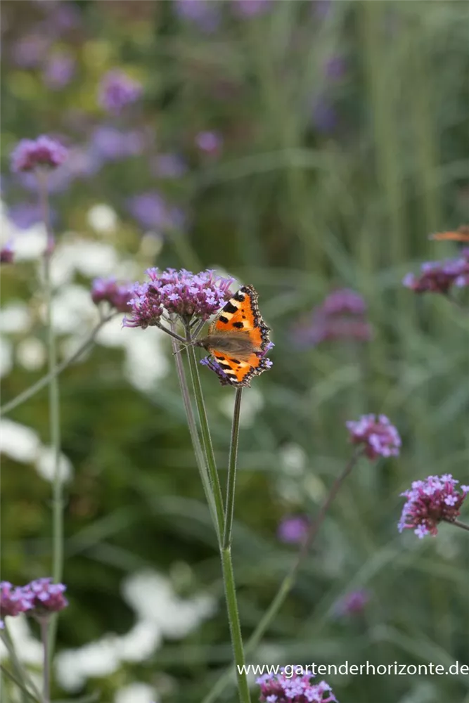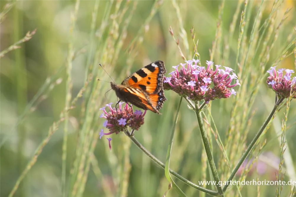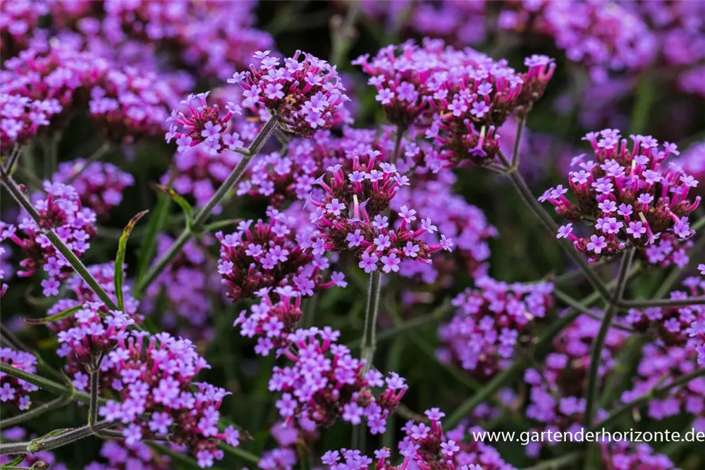 Das Eisenkraut (Verbena bonariensis) ist eine aufrechte wintergrüne Staude, die von Juli bis Oktober magentafarbene, in Dolden angeordnete Blüten bildet. An einem sonnigen Standort mit durchlässigem, nährstoffreichem Boden erreicht es gewöhnlich eine Höhe von ca. 1,5 m und wird ca. 40 cm breit.