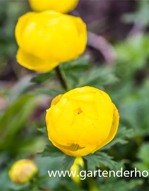 Trollius europaeus 'Lemon Supreme' bildet gefüllte, ballförmige, goldgelbe Blüten ab Mai.