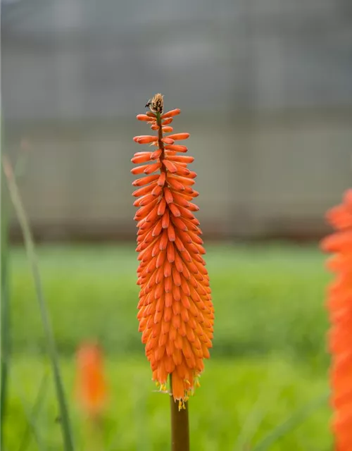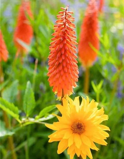 Kniphofia uvaria 'Royal Standard' bildet in Kolben angeordnete, rot-gelbe Blüten ab Juli.