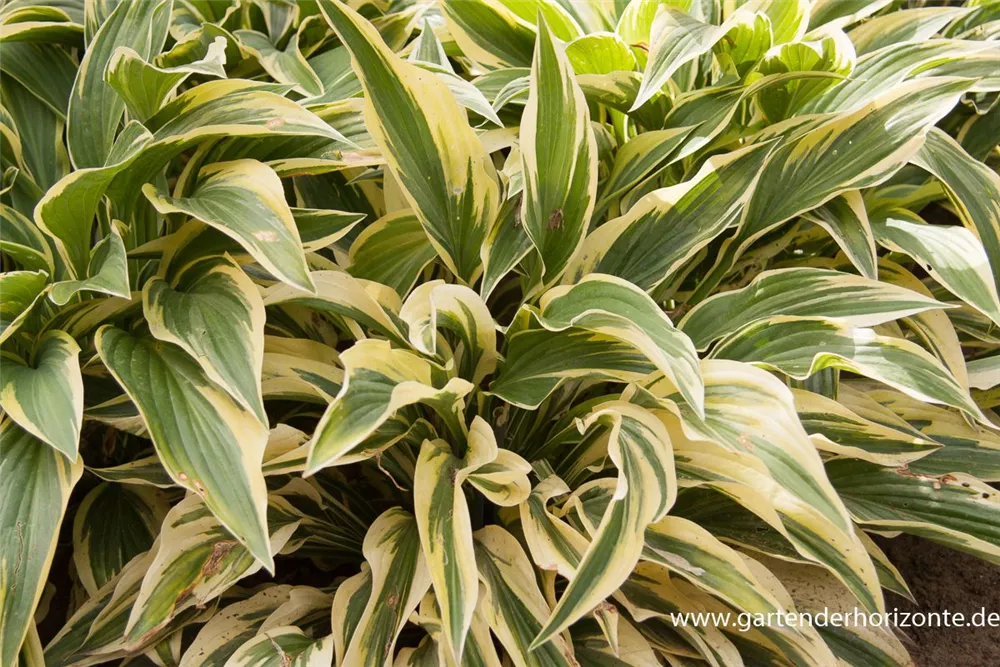 Hoher Blattschmuckwert. Die sommergrünen Blätter der Funkie 'Lakeside Dragonfly' sind mittelgrün, grundständig, ganzrandig und weisen einen cremegelben Rand auf.