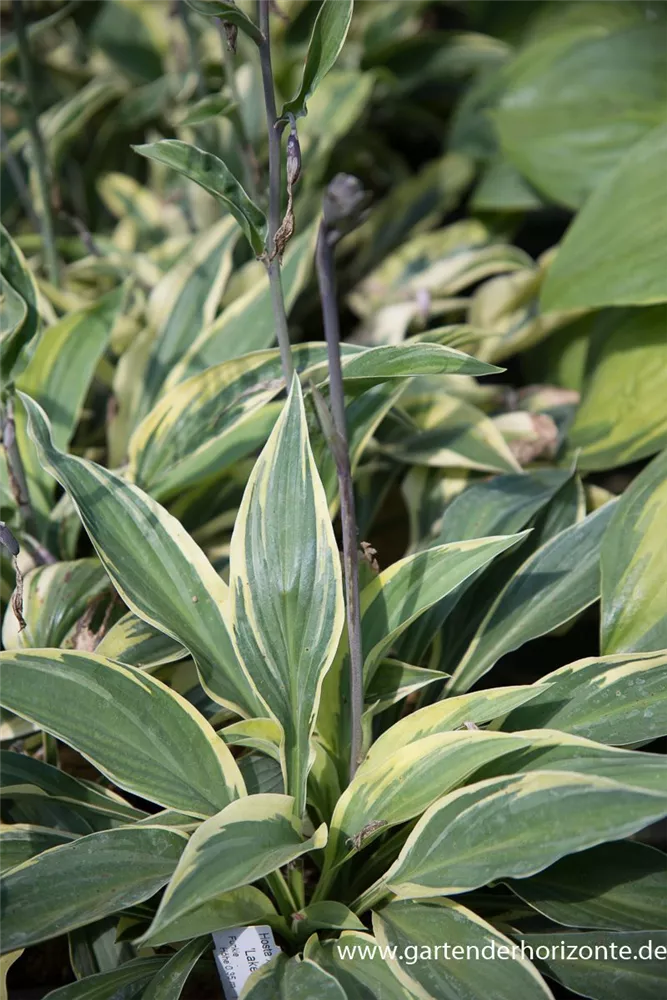 Hosta 'Lakeside Dragonfly' bildet helllilarbene Blüten ab Juli.