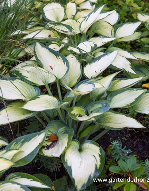 Hoher Blattschmuckwert. Die sommergrünen Blätter der Blaugraue Garten-Funkie 'Dress Blues' sind grau-grün, grundständig, ganzrandig und weisen einen cremegelben Rand auf.