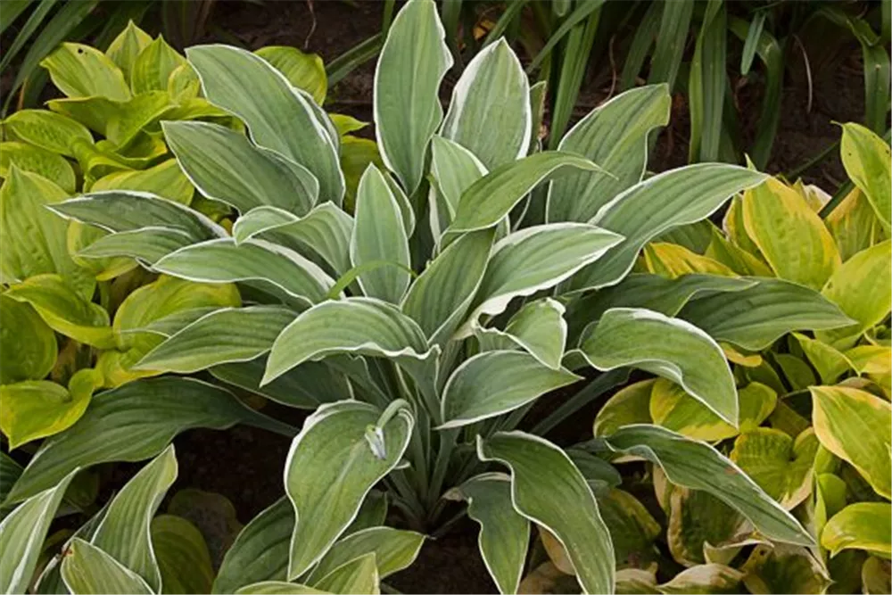 Hoher Blattschmuckwert. Die sommergrünen Blätter der Funkie 'Tom Schmid' sind dunkelgrün, grundständig, ganzrandig und weisen einen weißen Rand auf.