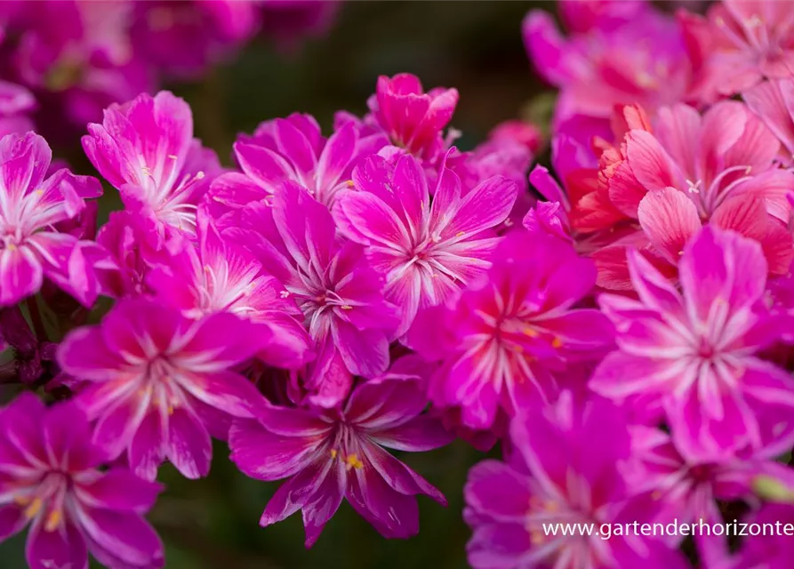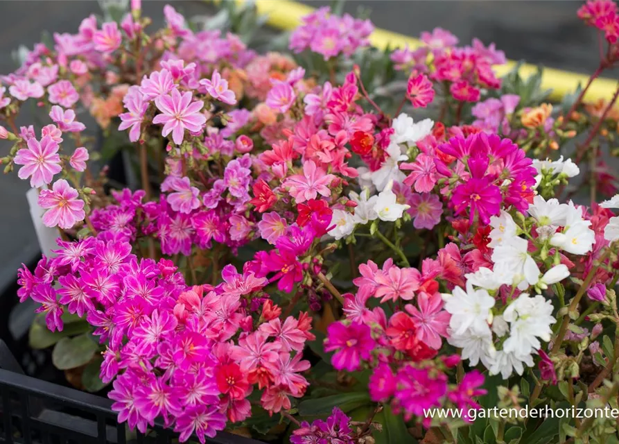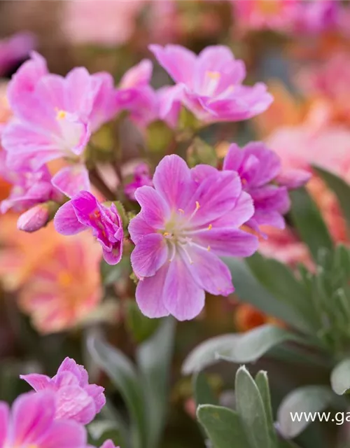 Lewisia cotyledon 'Regenbogen' bildet schalenförmige, rosafarbene Blüten ab Mai.