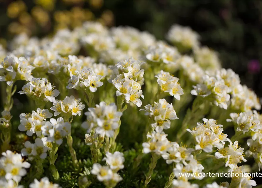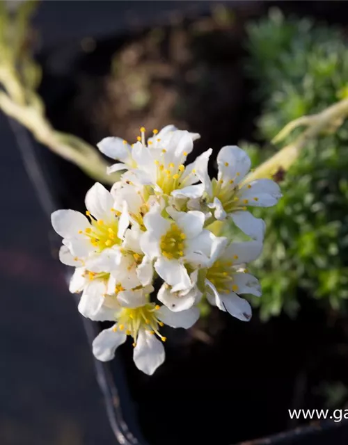 Saxifraga apiculata 'Alba' bildet weiße Blüten ab April.