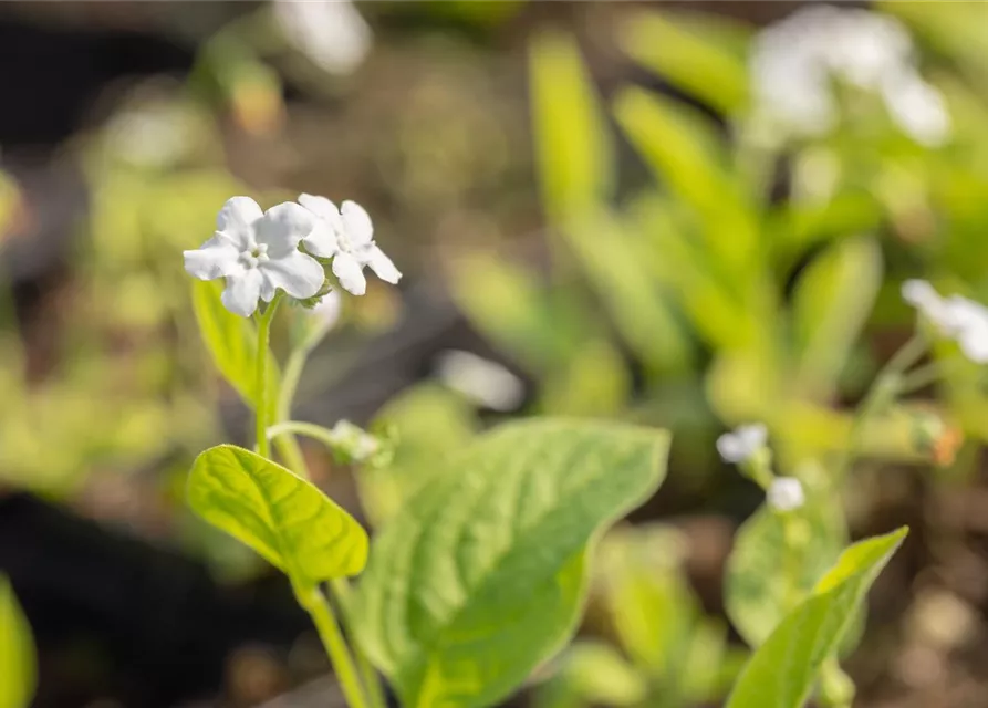 Omphalodes verna 'Alba' bildet in Trauben angeordnete, weiße Blüten ab März.