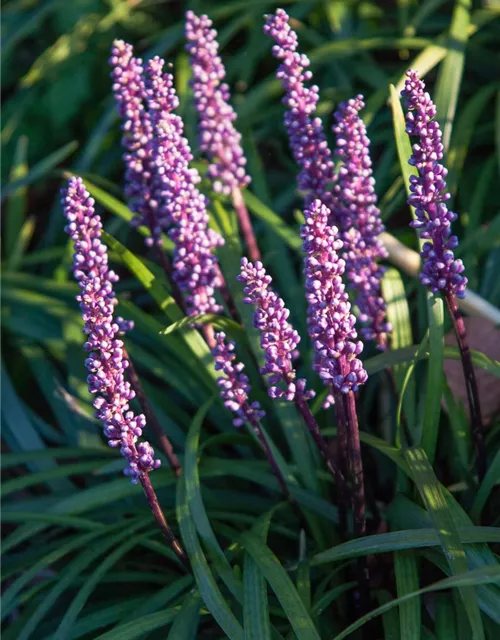 Liriope muscari 'Ingwersen' bildet in Rispen angeordnete, violette Blüten ab August.