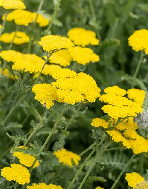Achillea clypeolata 'Moonshine' bildet in Dolden angeordnete, zitronengelbe Blüten ab Juni. Bei richtiger Pflege Nachblüte im September.