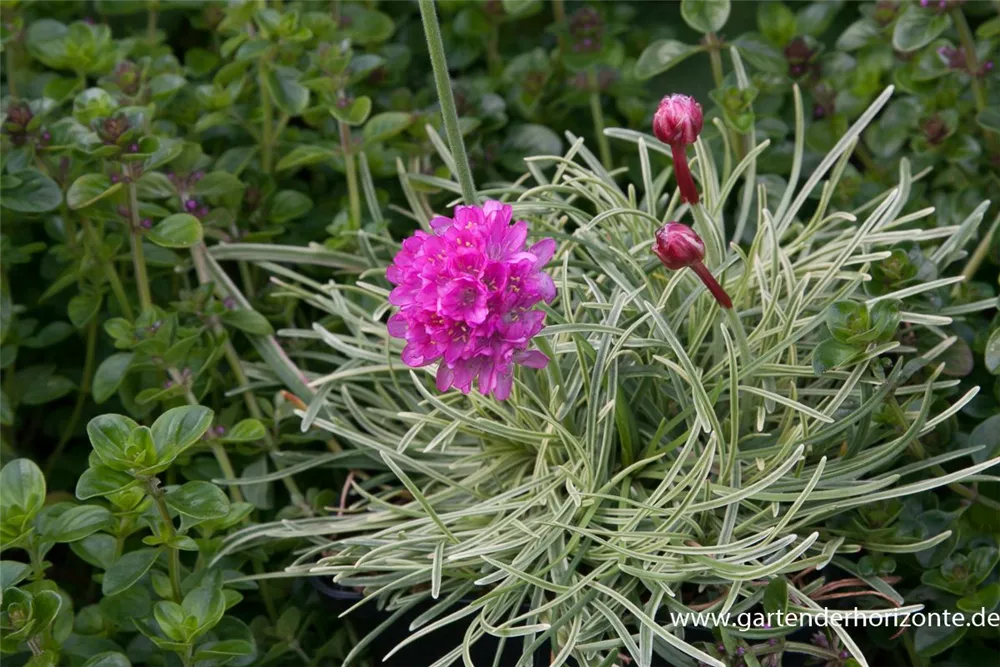 Armeria maritima 'Nifty Thrifty' bildet ballförmige, rosafarbene Blüten ab Mai.