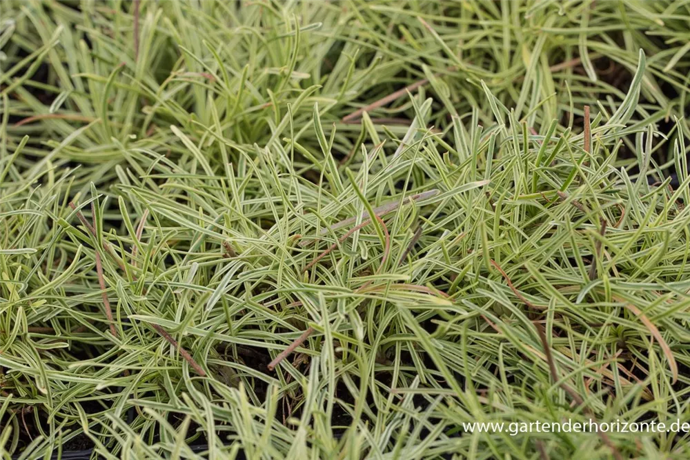 Die wintergrünen Blätter der Garten-Grasnelke 'Nifty Thrifty' sind grau-grün, lineal.