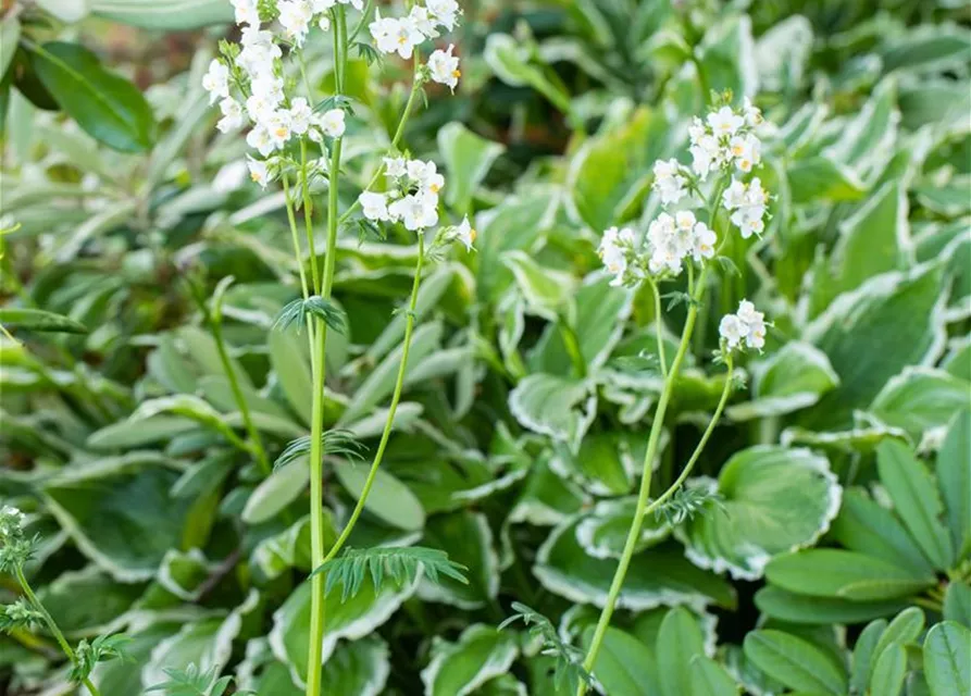 Polemonium caeruleum 'Album' bildet trichterförmige, weiße Blüten ab Mai. Diese verströmen einen angenehmen Duft. Bei richtiger Pflege Nachblüte von Juli bis August.