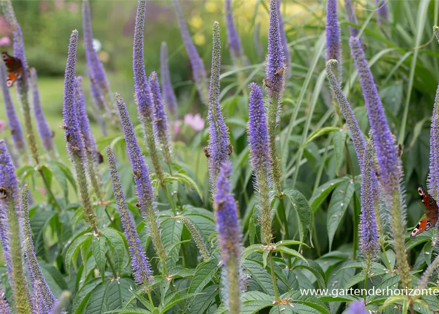 Veronicastrum virginicum 'Lavendelturm' bildet rachenförmige, in Trauben angeordnete, violette Blüten ab Juli.