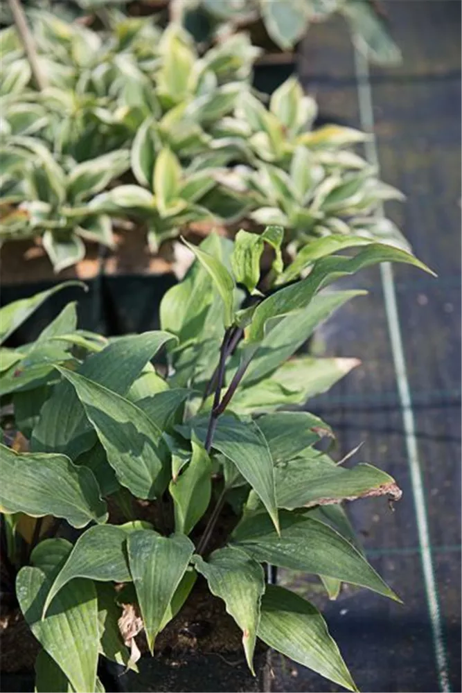 Die Garten-Lanzen-Funkie 'Red October' weist eine gute Frosthärte auf.