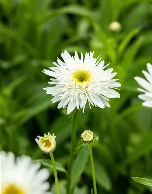 Leucanthemum x superbum 'Wirral Supreme' bildet gefüllte, körbchenartige, weiße Blüten ab Juli. Diese verströmen einen angenehmen Duft.